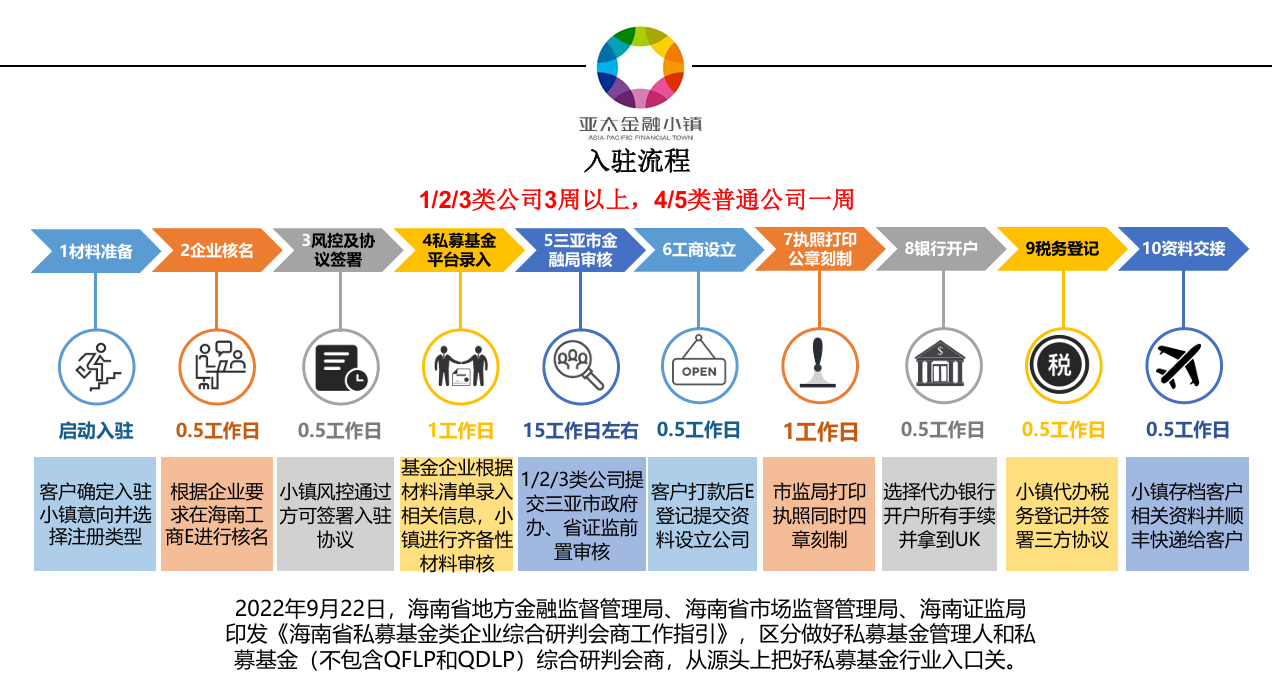 办理1/2类基金管理公司和3类基金合伙产品需要金融局审核,办理流程为两周以上,办理4/5类公司需要一周以上,另外,对于入驻小镇企业的基本户,必须在三亚的银行开立,具体银行由企业自行选择。